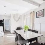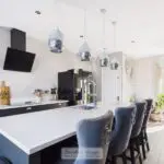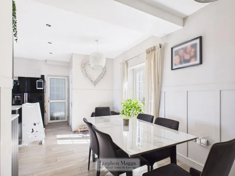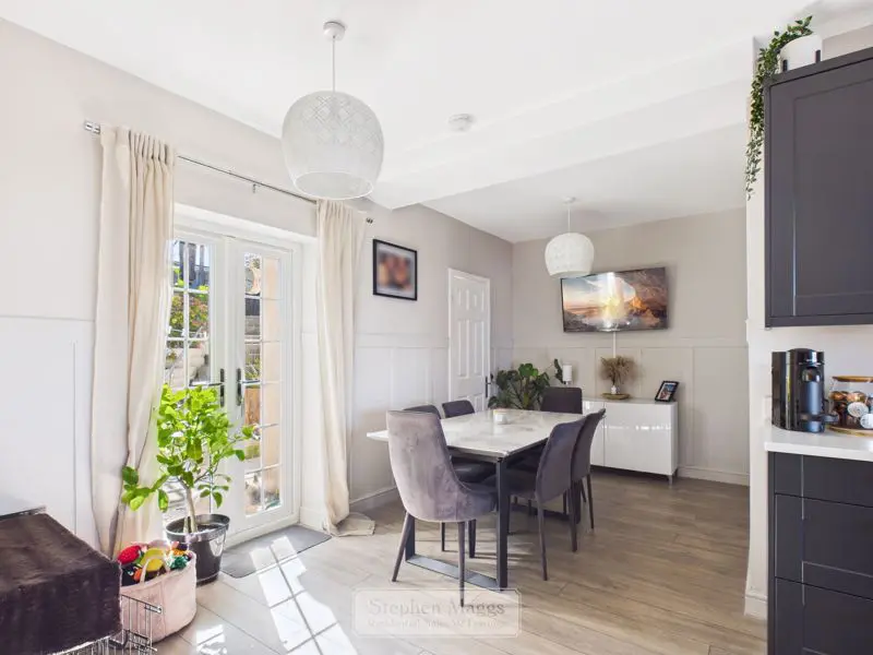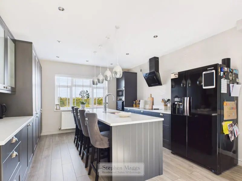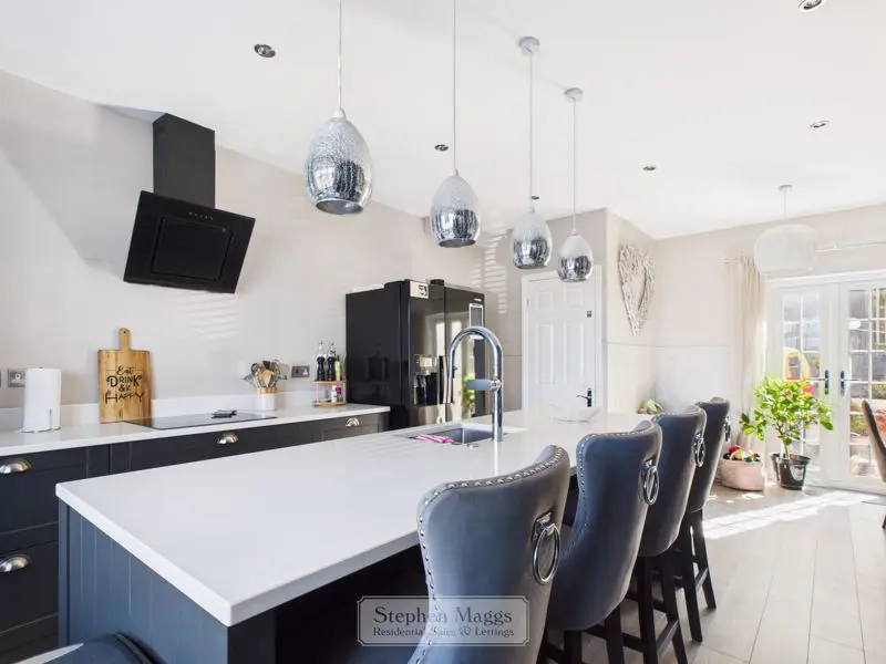 ‘L’ shaped, maximum dimensions. Double glazed window to the front with fitted venetian blind, double glazed French doors giving access to the rear garden. Fitted with a comprehensive range of graphite grey wall, base and full height units, Quartz worktops with built under stainless steel sink having a waste disposal unit, appliances to include, oven microwave, induction hob, extractor hood, dishwasher and wine chiller, recessed low voltage spot lights. The dining area has decorative panelling to dado height, recessed low voltage spotlights, doors to utility room, cloakroom and office.