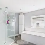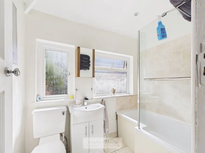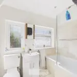 Two opaque double glazed windows to the rear, fitted with a white suite comprising of ‘P’ shaped bath with fitted glass shower screen and mixer shower, vanity wash hand basin, close coupled W.C, tiled floor, designer radiator, recessed low voltage spotlights.