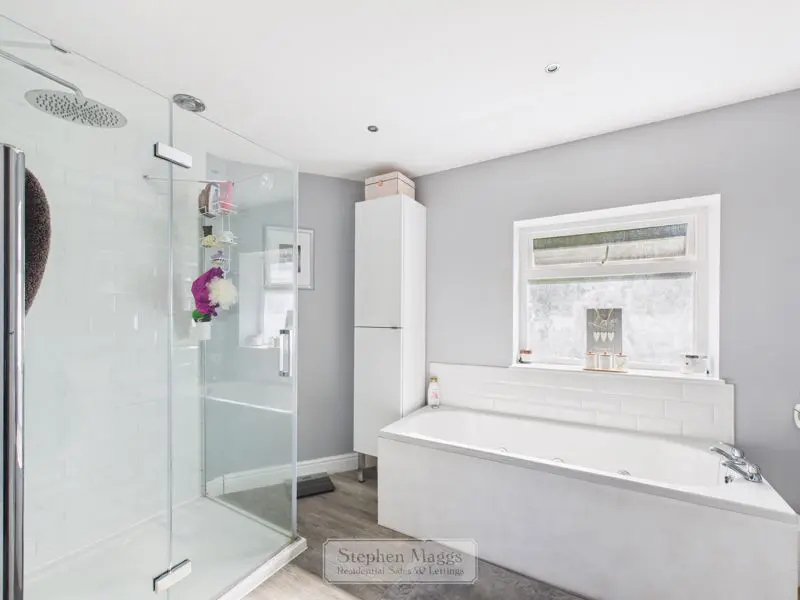 Opaque double glazed window to the rear, fitted with a white Jacuzzi bath, vanity wash hand basin, close coupled W.C, separate shower cubicle, tiled surrounds, designer radiator, recessed low voltage spotlights.