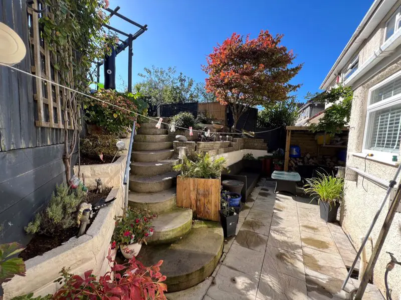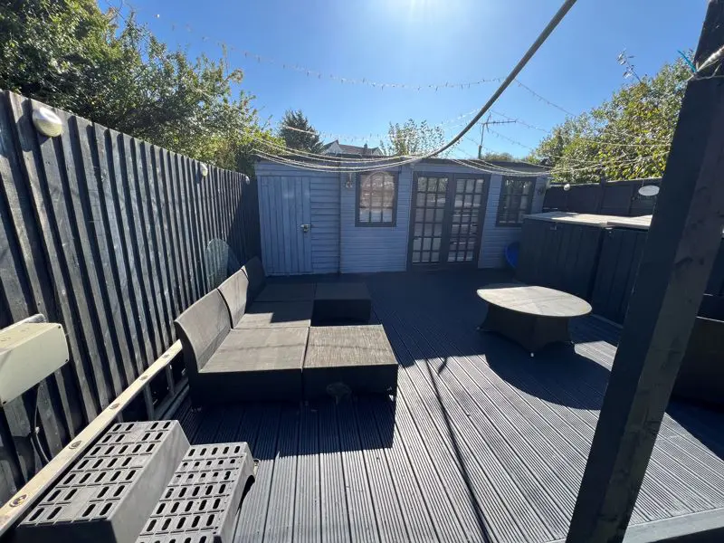 At the rear is an extremely private garden having an area of patio immediately adjacent to the house, with then steps up to a garden that is laid to lawn with well stocked flowerbeds and a large area of decking with pergola and outside power and lighting. To the rear is a timber built out house used as a bar/summer house, beside which is a timber garden shed.