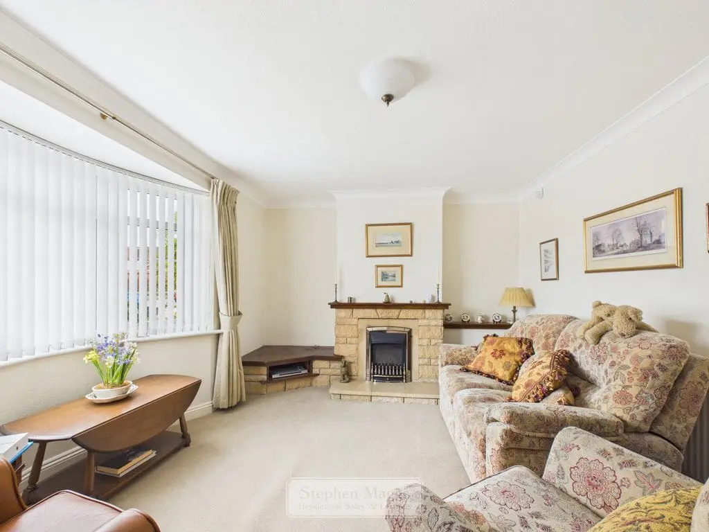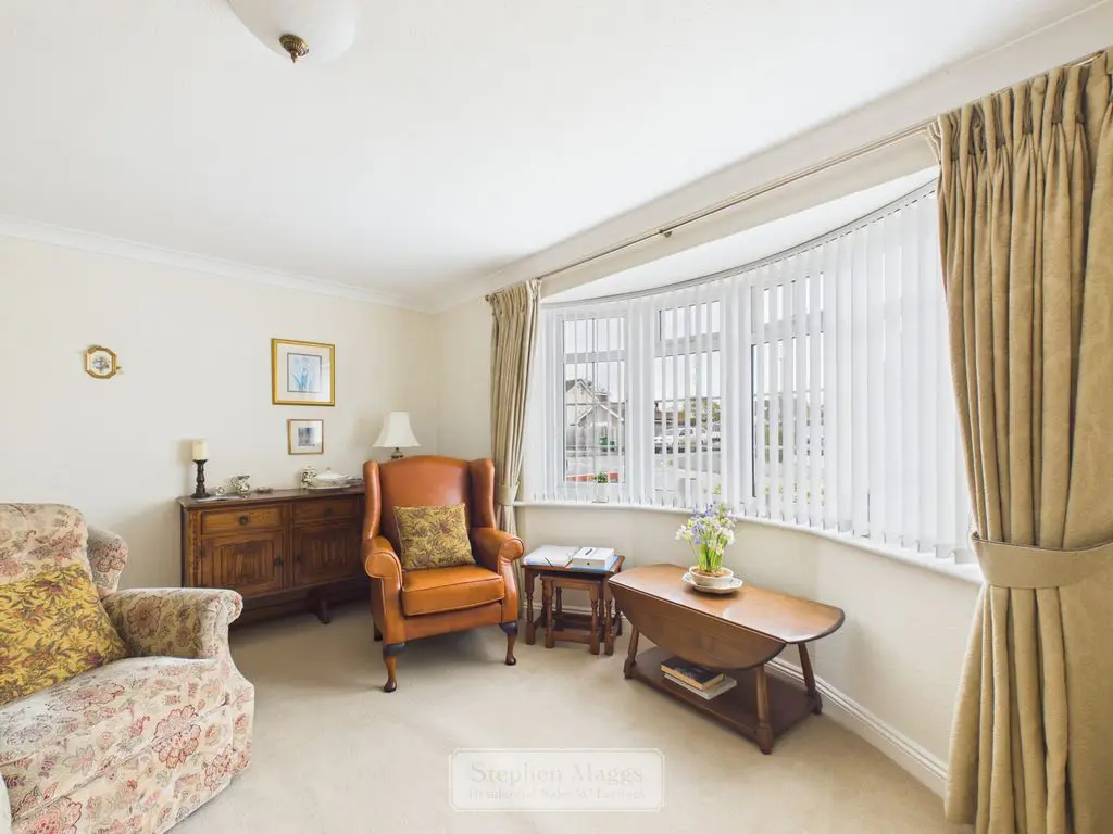 Double glazed bow window to the front with fitted vertical blind, stone built fireplace with display plinth, housing a gas living flame fire, double panelled radiator, television point.