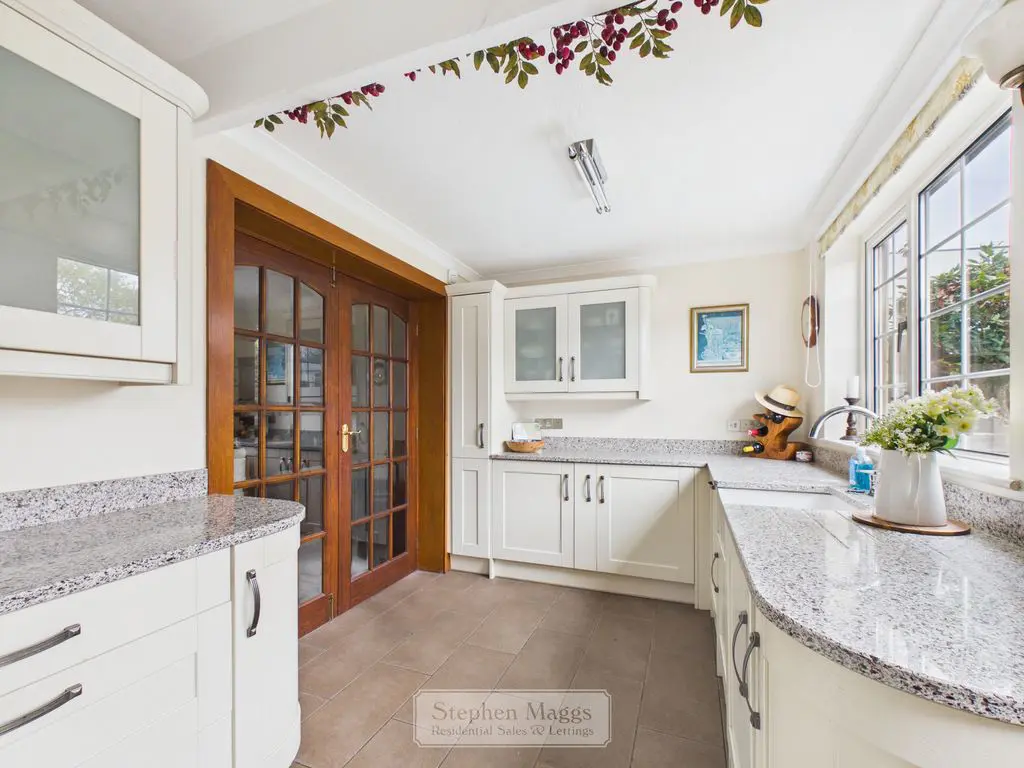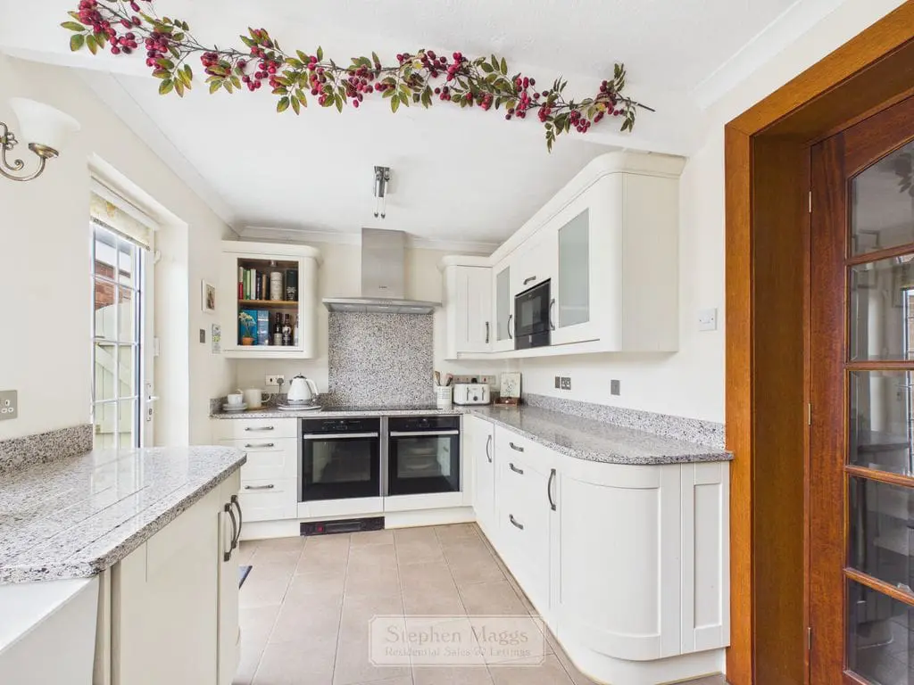 Double glazed window to the rear with fitted roller blind, double glazed door overlooking and giving access onto the rear garden. The kitchen is fitted with a comprehensive range of cream fronted wall units with light pelmets concealing worksurface lighting, base fitted units with Quartz worktop surfaces, inset Belfast style sink with mixer tap, two built- in single ovens, four ring glass hob with cooker hood over, built-in microwave, integrated dishwasher, washing machine, fridge and freezer, tiled flooring, kickspace radiator.