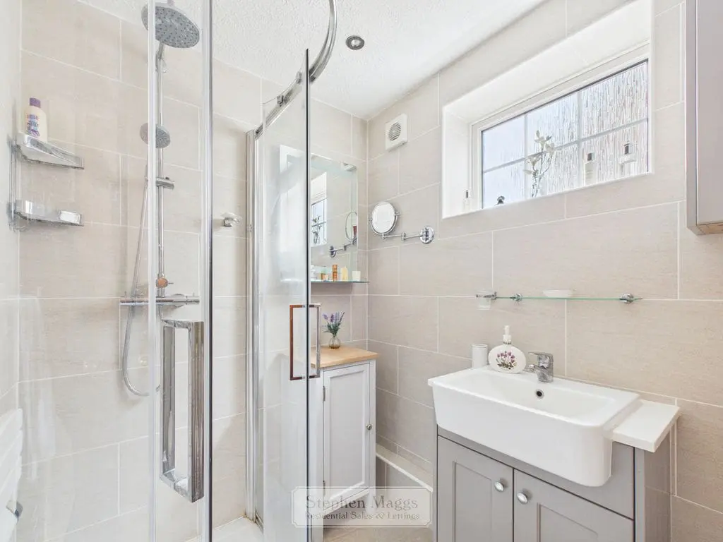 Opaque double glazed window to the side, fitted with a corner shower cubicle with mixer shower, vanity wash hand basin, close coupled W.C, tiled walls and floor, designer radiator, electric extractor fan.