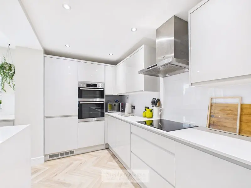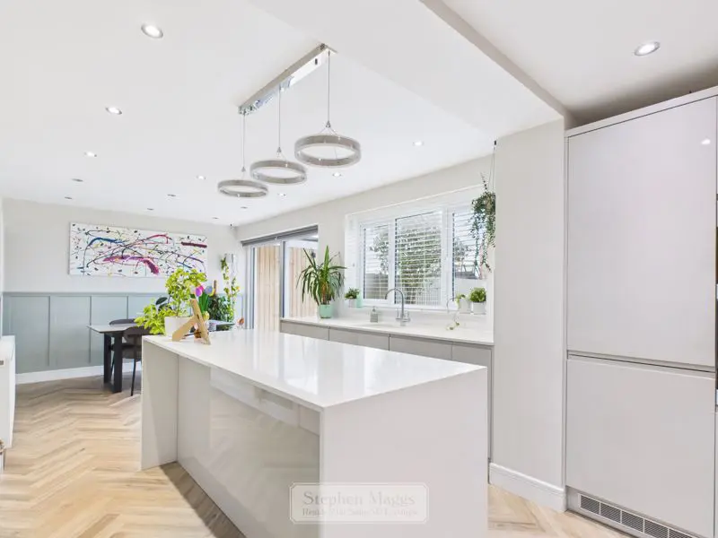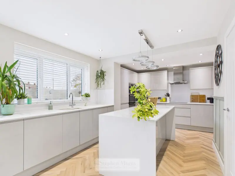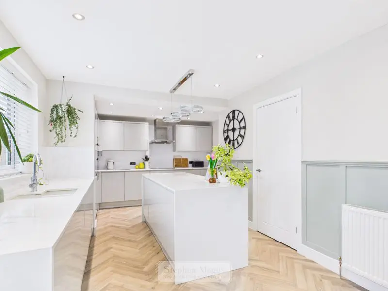 Double glazed window with fitted venetian blind to the rear, double glazed patio door with electric roller blind overlooking and giving access onto the rear garden. The kitchen is fitted with an extensive range of grey fronted wall and base units with Quartz worktop surfaces incorporating a built under 1.5 bowled sink unit, integrated appliances to include double oven, four ring induction hob with cooker hood over, fridge/freezer, washing machine and dishwasher, decorative panelling to dado height, recessed low voltage ceiling spotlights, double panelled radiator, large built in understair cupboard with light.