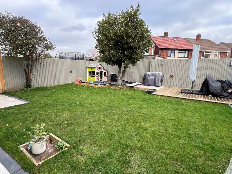 At the rear is a good size garden enclosed with lapwood fencing, having an area of patio immediately adjacent to the house with then a rear lawn, decked area and children’s play area.
