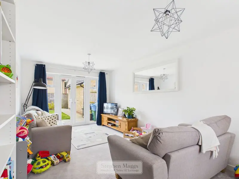 Double glazed window to the front with louvre blind, double glazed French doors and side windows overlooking and giving access onto the rear garden, two panelled radiators, television point.