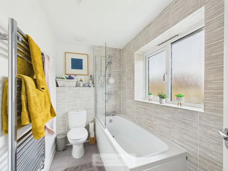 Opaque double glazed window to the rear, fitted with a white suite comprising of panelled bath with mixer shower over, glass shower screen, pedestal wash hand basin, close coupled W.C, tiled surrounds, tile effect laminated flooring, extractor fan, ladder style radiator.