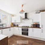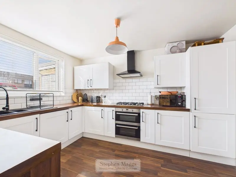 Double glazed window to the front with fitted Venetian blind. The kitchen is fitted with a range of white high gloss shaker style unit comprising wall units, and base units with timber effect worktop surfaces, inset 1.5 bowl single drainer sink unit, built-in double oven, five burner gas hob with cooker hood over, integrated washing machine and integrated fridge-freezer, double panelled radiator, fitted breakfast bar, tiled splashback, laminated timber flooring.