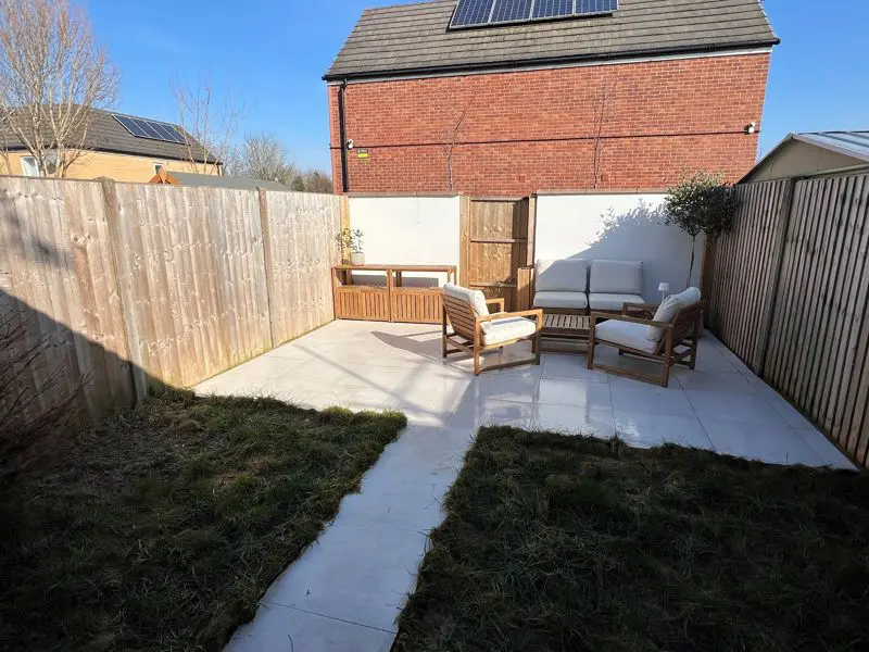 At the rear is a garden enclosed with render walling and fencing, having a rear pedestrian access, laid to a combination patio and lawn with outside light.