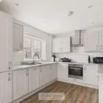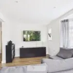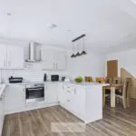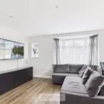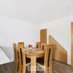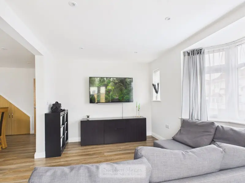 Double glazed bay window to the front, two further double glazed windows with fitted venetian blinds and double glazed French door giving access onto the garden. underfloor heating, television point. The kitchen area is fitted with a range of wall and base units with contrasting roll edged worktop surfaces, inset stainless steel 1.5 bowled single drainer unit, integrated appliances to include fridge/freezer, dishwasher, slide out bin, tiled surrounds, recessed low voltage spotlights, understair storage cupboard and also understair utility area which has space and plumbing for automatic washing machine.