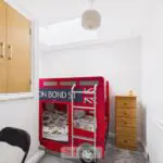 Double glazed Velux window, single panelled radiator, built in over stair storage cupboard.