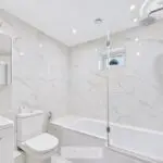 Opaque double glazed window to the side, fitted with a white suite comprising of a ‘P’ shaped bath, mixer shower with both body and overhead sprays, vanity wash hand basin, close coupled W.C, fully tiled walls and floor, recessed low voltage spotlights, extractor fan, designer radiator.