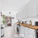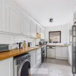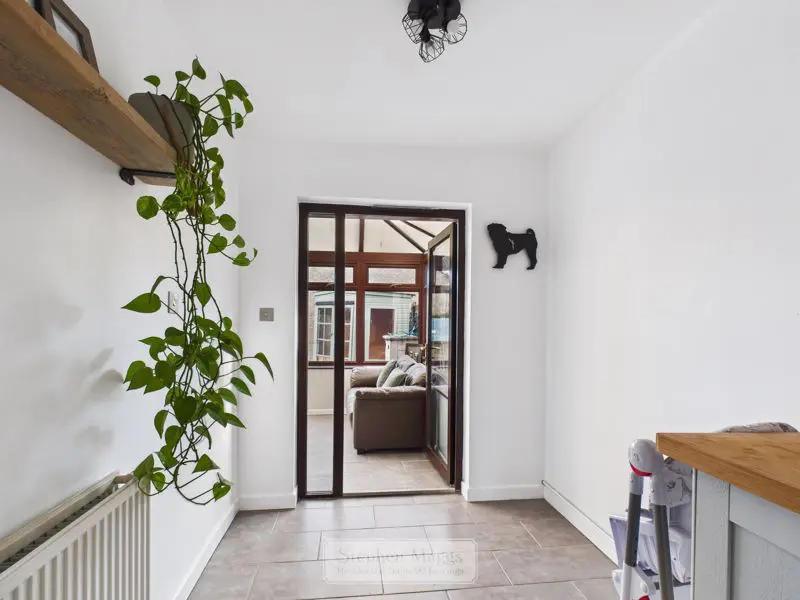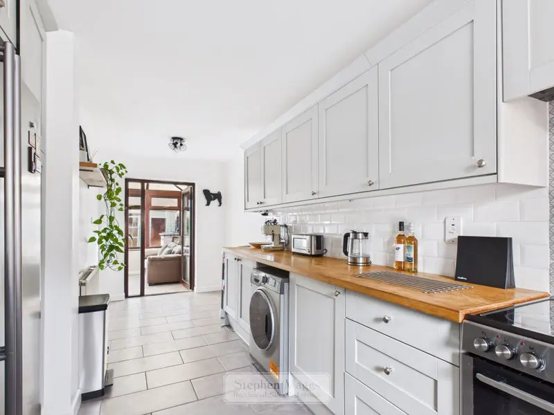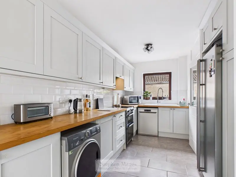 Double glazed window to the front, double glazed door giving access onto the Conservatory at the rear. The kitchen has been refitted with a comprehensive range of wall and base units with wood block worktop surface, inset single drainer sink with mixer tap, space and plumbing for automatic washing machine and dishwasher, electric cooker point with cooker hood over, large recess for American style fridge/freezer, tiled splashbacks and tiled flooring, double panelled radiator.