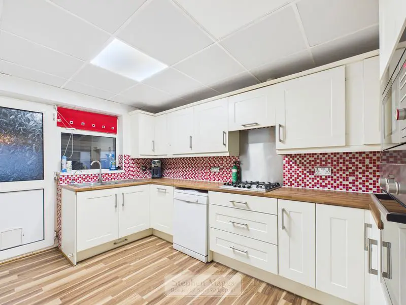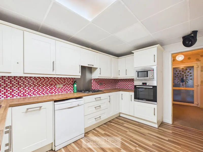 Double glazed window and door overlooking and giving access onto the conservatory at the rear. Refitted with a range of cream fronted wall and base units with wood effect roll edge worktop surfaces, inset stainless steel 1.5 bowled single drainer sink unit, built in Bosch single oven, microwave, four burner gas hob with cooker hood over, plumbing for dishwasher, tiled surrounds, double panelled radiator, opaque double glazed door to: