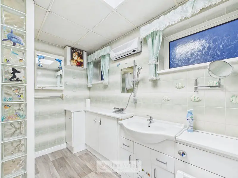 A larger than average bathroom having two opaque double glazed windows to the front, walk in tiled shower cubicle, vanity wash hand basin, W.C with concealed cistern, further fitted cupboards, mixer tap with shower head over wash basin, tiled walls, designer radiator.