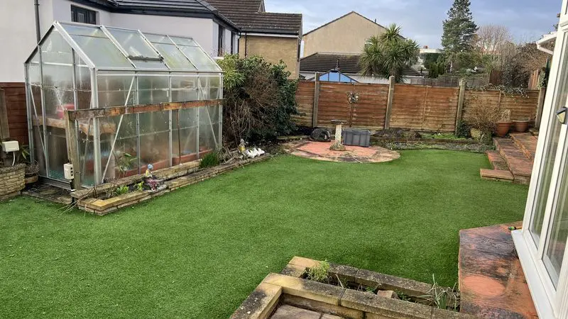 The rear garden is enclosed with lapwood fencing, laid to a combination of paving and artificial grass with flowerbed and greenhouse.