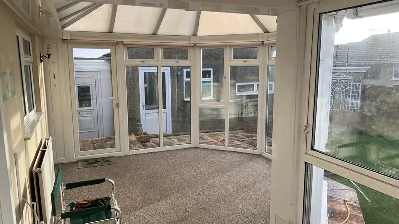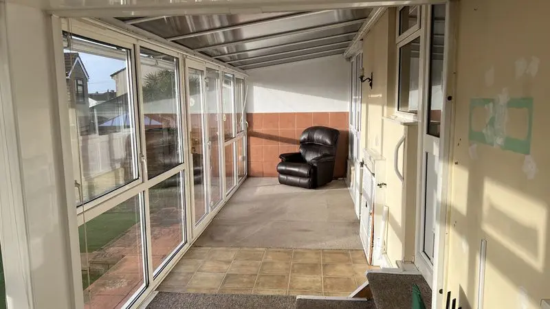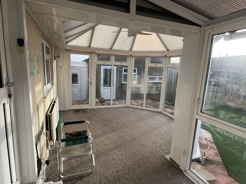 A large ‘P’ shaped double glazed conservatory having two double panelled radiators, plumbing for washing machine, polycarbonate roof with ceiling light fan, two doors giving access onto the rear garden.