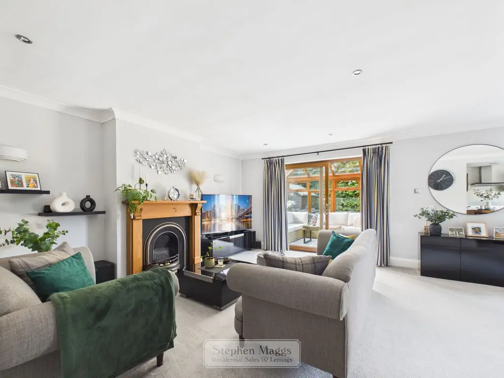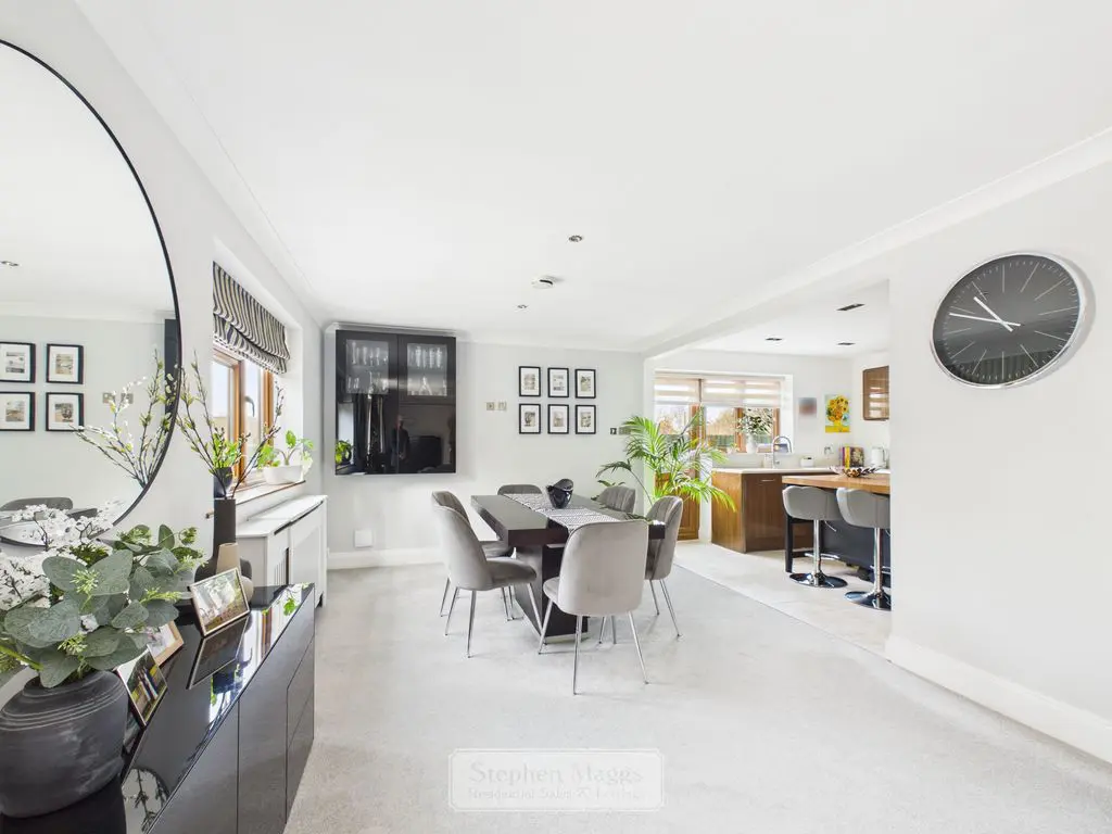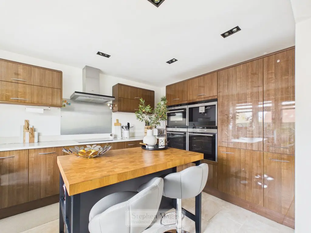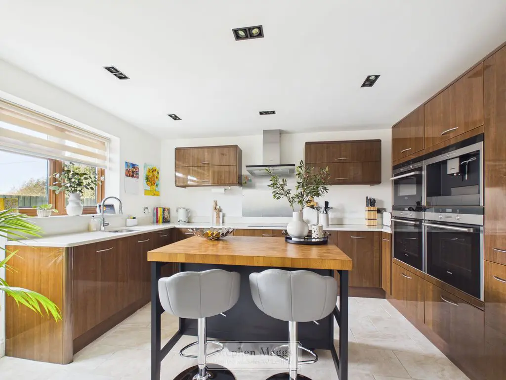 Double glazed window and door overlooking and giving access onto the side. The kitchen is fitted with a comprehensive wall and base units with contrasting quartz worktop surfaces, built-under 1.5 bowl sink unit, integrated dishwasher, two built single ovens, microwave oven, coffee maker, four ring induction glass hob, cooker hood over, recessed low voltage spotlights.