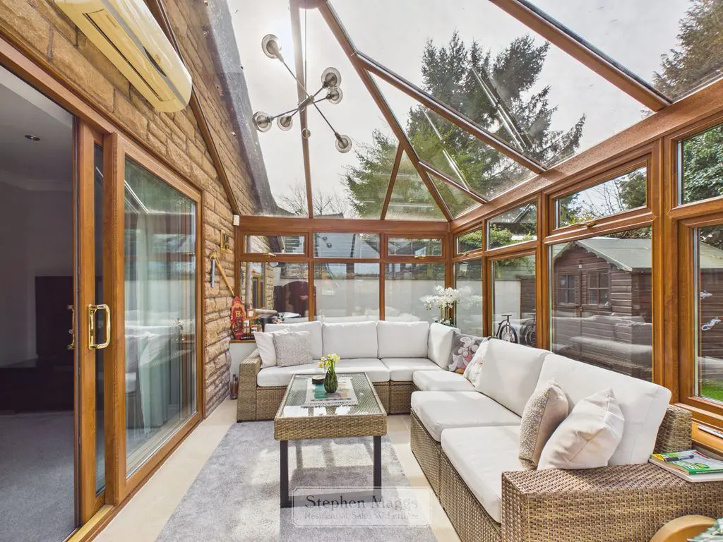 A double glazed conservatory with tiled flooring, light, air-conditioning unit, double glazed French doors giving access onto the rear garden.