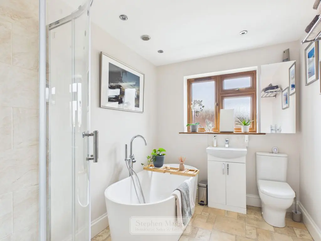 A larger than average bathroom having an opaque double glazed window to the side, fitted with a corner shower cubicle with both over head and flexible body sprays, free standing bath, vanity wash hand basin, close coupled W.C, designer radiator, low voltage spotlights, extractor fan.