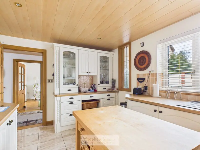 Double glazed window to the front with fitted venetian blind. The kitchen is fitted with an extensive range of Shaker style wall and base units with timber effect worktop surfaces, inset single drainer sink unit with mixer tap, integrated larder style fridge and dishwasher, Rangemaster electric cooker range with cooker hood over, tiled surrounds, recessed low voltage spotlights, panelled radiator, tiled floor.