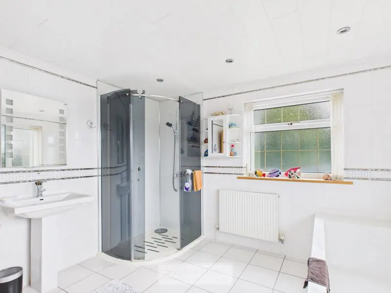 An extremely large bathroom with opaque double glazed windows to the front and the side, fitted with a large White panelled bath, pedestal wash hand basin, close coupled W.C, separate shower cubicle with mixer shower, tiling to all walls and floor, recessed low voltage ceiling spotlights, panelled radiator and heated towel rail.