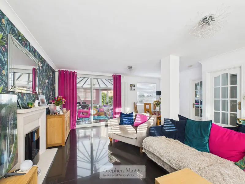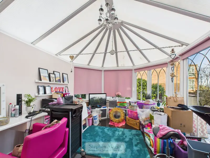 A substantial double glazed Conservatory having a polycarbonate roof, designer radiator, continuation of ceramic floor tiling, French doors overlooking and giving access onto the rear garden.