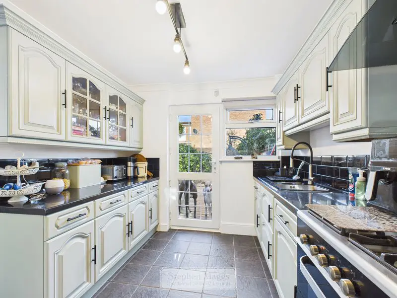 This room has been enlarged by the removal of the original hallway. Double glazed bow window to the front with deep display sill and fitted Venetian blind, double glazed window with Venetian blind overlooking the rear garden, and patio doors opening onto the Conservatory. Marble fireplace with electric living flame style fire, television point, two designer radiators, ceramic floor tiling throughout, part glazed door to inner hallway and further part glazed door to: