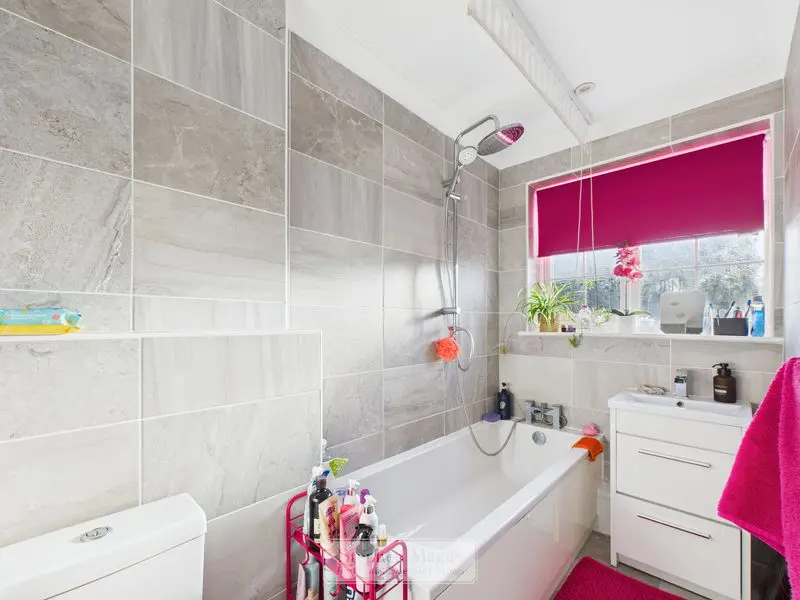 Opaque double glazed window to the front, fitted with a white suite comprising of a panelled bath with mixer shower and roll down shower screen, vanity wash hand basin, close coupled W.C, tiled walls and floor, designer radiator, recessed low voltage spotlights.