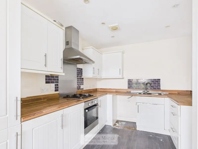 Double glazed window to the front, fitted with a range of shaker style wall and base units with contrasting roll edge worktop surfaces, built in single oven, four burner gas hob with cooker hood over, stainless steel single drainer sink unit, tiled surrounds, extractor fan, recessed low voltage spotlights, double panelled radiator.