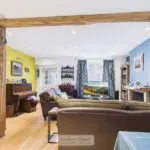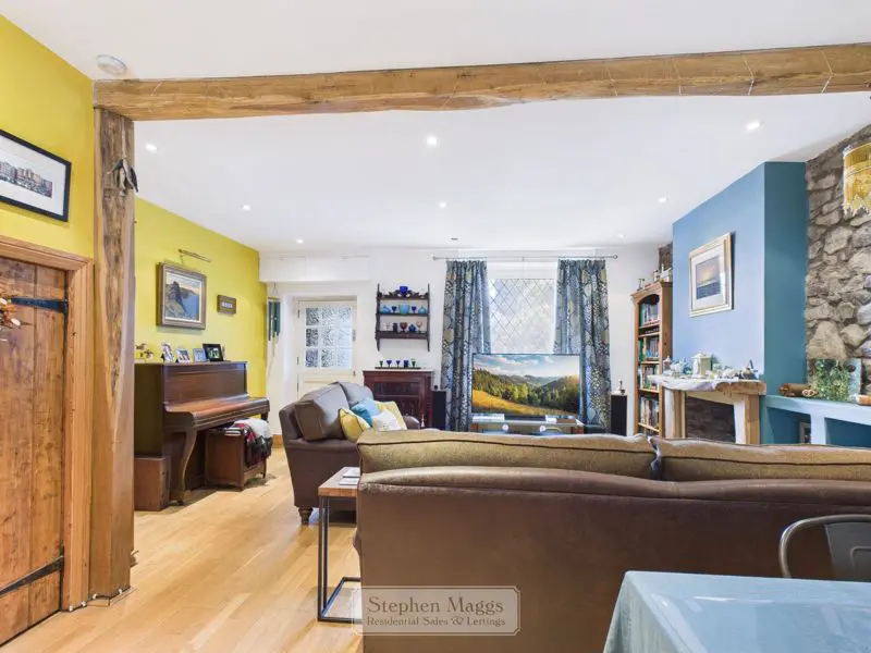 A large open plan living area having a leaded double glazed tilt and turn window to the front, feature open fireplace with decorative timber surround and stone hearth, one double panelled radiator and one single panelled radiator, television point, recessed low voltage spot lights, wooden flooring, under stair storage cupboard, part exposed natural stone walls, glazed door to: