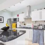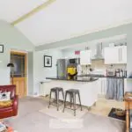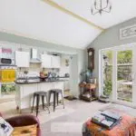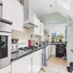 Double glazed French doors with side panels overlooking and giving access to the rear garden. The dining area having part vaulted ceiling, staircase rising to the first floor. The kitchen area has an opaque double glazed window to the rear. Fitted with a range of cream fronted Shaker style wall and base units with contrasting roll edge worktop surfaces ,breakfast peninsular with cupboards to the rear, inset stainless steel single drainer sink unit, tiled surrounds, built in Zannusi single over, four burner gas hob with cooker hood over, tiled floor, Worcester gas fired combination boiler supplying central heating and domestic hot water, two double glazed Velux windows, recessed low voltage spotlights.